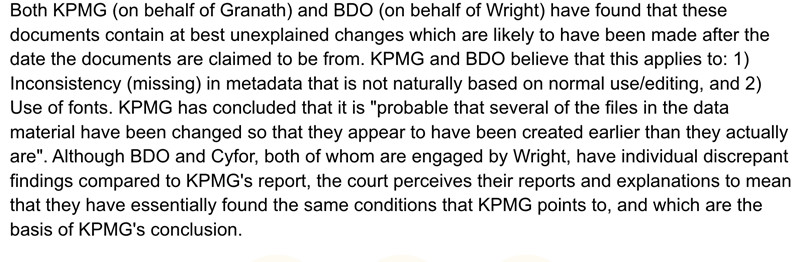 根据判决书的内容,澳本聪向法庭提交过「比特币白皮书」早期版本,但无论是代表Hodlonaut的律师团队、还是代表澳本聪的BDO团队,都在文件中发现了仅存在于白皮书发行日期后的证据,例如包含当时不可用的字体。判决写道:KPMG(代表Granath)和BDO(代表Wright)都发现这些文件包含无法解释的更改,这些更改很可能是在文件声称的日期之后进行的。