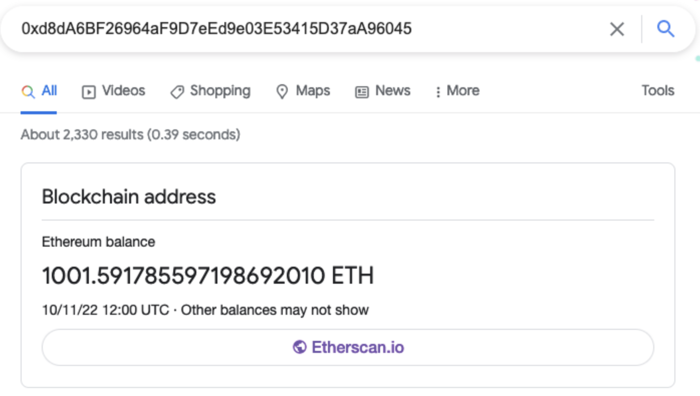 另外有个有趣的事实是,据The Block稍早报导,当前Google搜索引擎在搜索以太坊钱包地址时,已可直接显示地址ETH余额。据悉,数据由以太坊区块浏览器Etherscan提供。